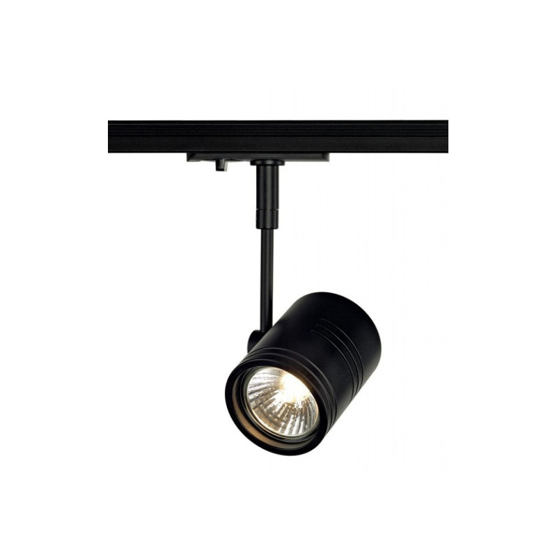 Elegant spot noir GU10 pour rail un allumage. Possibilité d'y insérer une led GU10 230V type premium (voir notre catalogue PREMIUM LED ). Appareil livré sans lampe.