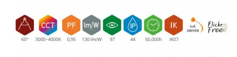 Réflecteur interne en thermoplastique IP44 à étanchéité intégrale. Il est par exemple impossible à des insectes d'y pénétrer.Le faisceau de rayonnement est de 60°. Faisceaux plus étroits sur demande.